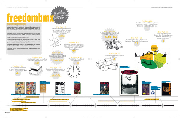 Endlich können brennend interessante Fragen wie z. B. „Wie viele Veranstaltungsberichte hat die freedom in 18 Jahren aus Heinsberg gebracht?“, „Wie hoch ist der Prozentanteil von Covern, die in Köln entstanden sind?“ oder auch „Wie viel Liter Sojamilch werden während einer durchschnittlichen freedombmx-Produktion getrunken?“ beantwortet werden, denn wir haben uns im Archiv eingeschlossen und 99 Ausgaben akribisch ausgewertet. Als Bonus gibt es eine Trendzeitleiste, auf der man exakt ablesen kann, wann das Radsetup, das man gerade fährt, aus der Mode gekommen ist.