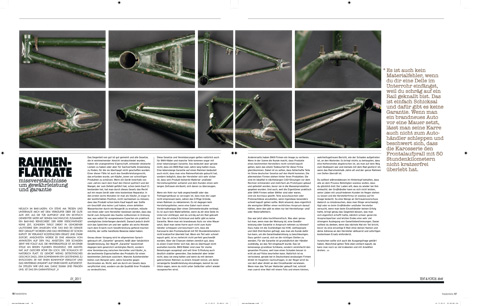 Zwei Drittel der gezeigten Tricks würden auch als Teil der Oldies but Goldies Story durchgehen, aber zum Glück reißt Christoph Werner es mit einem Newschoolgeweih wieder raus. Markus Wilke berichtet über einen amüsanten Nachmittag in Mühlhausen, und hat neben beträchtlichem historischem Fachwissen auch noch die Devise für 2011 parat: Sinnlos und gefährlich, so lieben wir BMX!