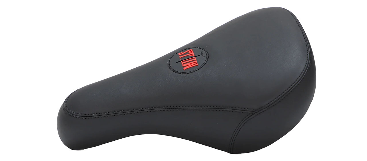 Lewis Mills Signature Pivotal Seat ist gut gepolstert, damit man such auf der Fahrt zum nächsten Spot auch mal bequem hinsetzen kann. Er hat außerdem eine Oberseite aus drei vernähten Panelen und wenn man die Augen zusammenkneift, dann sieht er wegen des roten Pivotalpatchs mit ein bisschen Fantasie wie der legendäre Signaturesattel von Nigel Sylvester aus.