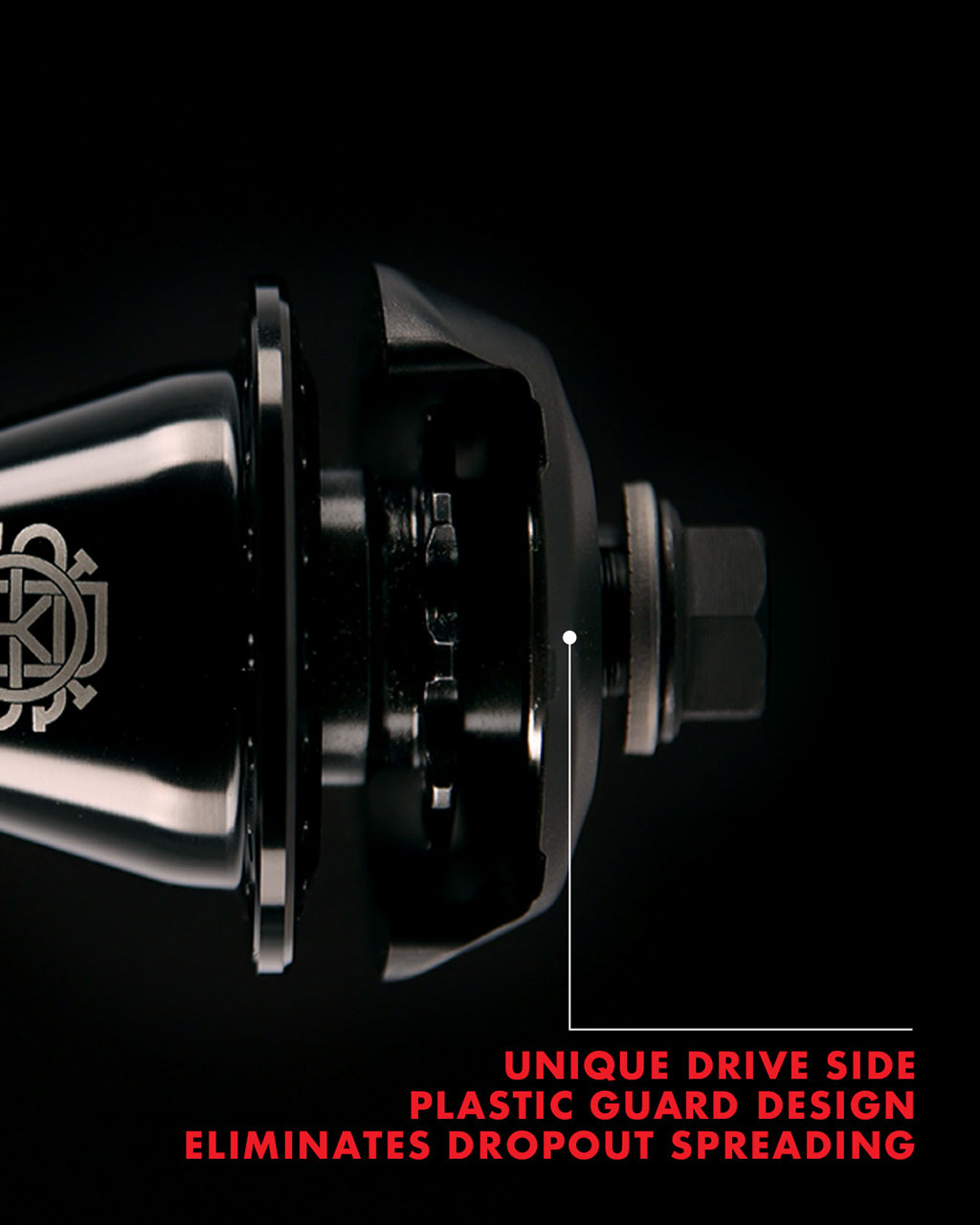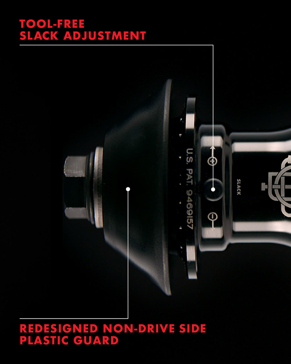 Basierend auf dem direkten Feedback von Odyssey-Teamfahrern wie Matt Nordstrom, Dennis Enarson, Broc Raiford und Johnny Raekes verfügt der Clutch Pro außerdem über zwei neue Hubguards. Diese bieten maximalen Schutz für Kette und Speichen und machen es überflüssig, die Ausfallenden während des Einbaus auseinander zu drücken. Was ja ziemlich nervig sein und sich nachteilig auf die Integrität des Rahmens auswirken kann. Auf der Nicht-Driverseite deckt das Hubguard die Speichen zudem nun noch besser ab.