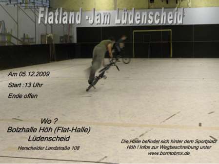 Nach zwei erfolgreichen inoffiziellen Flatland Jams in Lüdenscheid, nun wie versprochen die erste offizielle Flatland-Jam am 5.12.2009 ab 13 Uhr...