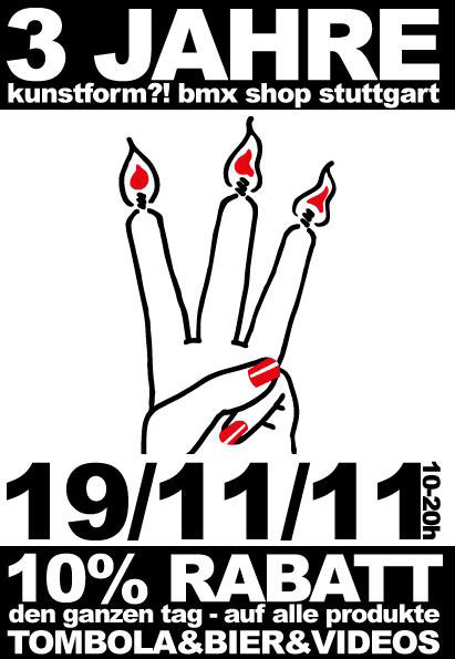 Drei Jahre kunstform?! BMX-Shop in Stuttgart, das muss ausgiebig gefeiert werden – und zwar mit Tombola (zu gewinnen gibt es einen Warengutschein im Wert von 150 Euro), Bier und jeder Menge BMX-Videos im Kinoformat!