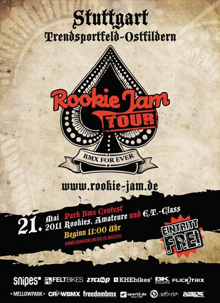 Der Rookie Jam wurde in diesem Jahr zu einer dreiteiligen Tour ausgebaut, deren zweiter Stopp auf dem Trendsportfeld in Stuttgart-Ostfildern über die Bühne geht. Der Park hat eine Bowl- und eine Streetsection mit vielen verschiedenen Obstacles und Rampen. Gestartet wird in drei verschiedenen Klassen, wobei die Rookie-Klasse für junge Fahrer und Anfänger gedacht ist, während sich die älteren Semester in der E.T.-Klasse austoben können und in der Amateurklasse 15 Startplätze für die vom 8. bis 10. Juli stattfindenen BMX Masters im Kölner Jugendpark vergeben werden.