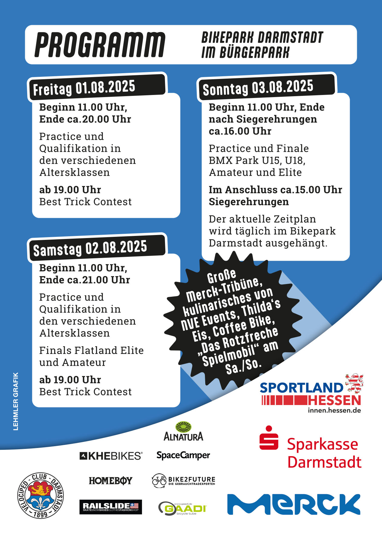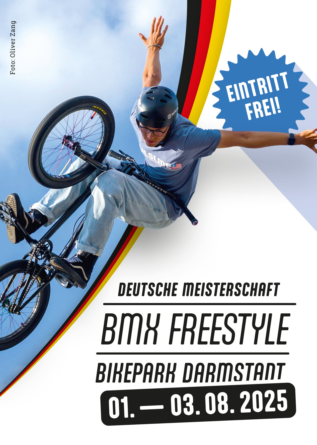 SAVE THE DATE! Nach dem großen Erfolg im vergangenen Jahr, findet die Deutsche Meisterschaft in BMX-Park und -Flatland vom 01.–03. August 2025 wieder im Bikepark Darmstadt statt.