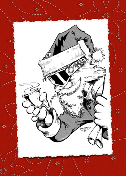 “In the spirit of the season – here’s a drawing I found from 1981 that I did for a little company back then called Oakley. Founder and sponsor of mine Jim Jannard asked me to make their company Christmas card and this is what I came up with. Unfortunately this design was rejected since Santa had a pipe in hand – the next iteration he held an Oakley grip.”
