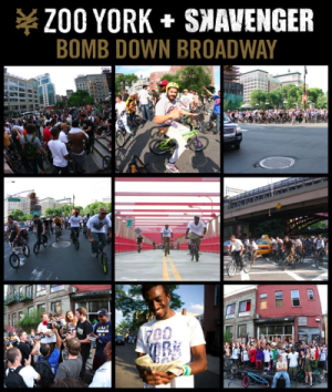 Ein BMX-Rennen der etwas anderen Sorte. Ohne Startgatter und ohne bunte Jerseys. Dafür mit relativ wenig Bremsen und relativ vielen Pegs. Bomb down Broadway war ein BMX Race durch NYC. Zoo York hat ordentlich Kohle für die Gewinner ausgesetzt und siehe da: Eine ordentliche Meute potentieller Racer war vor Ort. Eine geile Idee, checkt das Video.