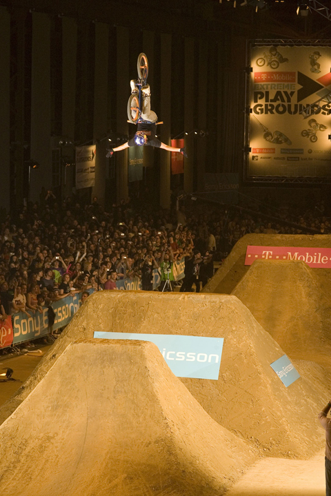 Im BMX Dirt Jump Finale lief zunächst alles auf Höchstniveau: Vorjahressieger Rob Darden legte gemeinsam mit Patrick Guimez (FRA) und Ryan Guettler (AUS) ordentlich vor und geizten nicht mit 720s und anderen nett anzuschauenden Trick-Einlagen. Dann aber kam mit Anthony Napolitan der Mann, der am Wochenende nicht nur sein Debüt bei den T-Mobile Playgrounds gab, sondern auch seit 2009 die Krone des Weltmeisters im BMX Dirt trägt und aus Höchstniveau Weltklasse machte.