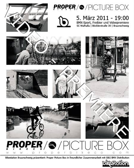 Das neue Proper-Video Picture Box ist fertig und Bikestation Braunschweig veranstaltet aus diesem Anlass am 5. März im Walhalla Skatepark eine Videopremiere inklusive Freibier. Der Trailer ist auf jeden Fall vielversprechend, also nicht verpassen, denn Shaun Jinks, Alex Platt, Gav Shortall, Mike Miller, Janis Cunculis, Shane Rieder, Mike Mastroni, Max Wood und Dan Figg haben für die DVD unzählige Spots in England, den USA, Wales, Holland, Spanien, Belgien und Frankreich auseinander genommen.