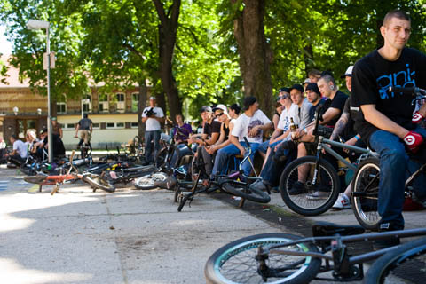 Welcher Jam wird schon durch eine Verlosung im Radio beworden, bei der auch noch ausnahmslos weibliche Wesen teilgenommen haben sollen? Dementsprechend war der Jam auch gut besucht. Neben den üblichen Verdächtigen, die sich eigentlich auf jedem erdenklichen Jam rumtreiben, war diese Veranstaltung überflutet von Besuchern aus der näheren Umgebung von Erfurt. Es tummelten sich sogar einige Mountainbiker im Pulk der gierigen Streetmeute. Die farbigen Unterhosen, die unter den runterhängenden Tighten aufblitzten, stachen in die Augen und verhießen nichts Gutes. Nur der Anblick der durchgestylten Erfurtlocals tröstete über die Misere der Neonfarben hinweg.