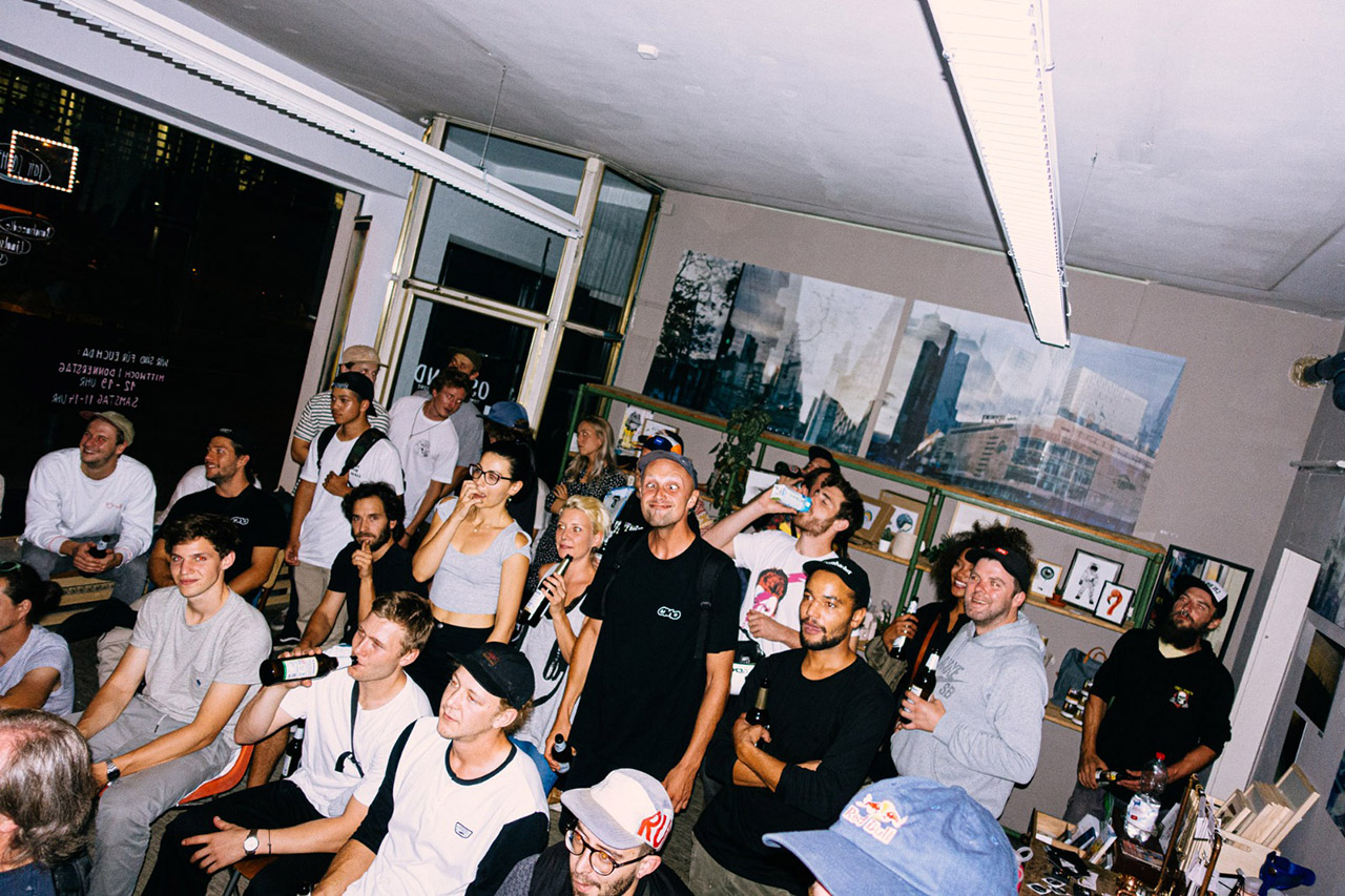Zur Feier des Tages hatte Bruno Hoffmann ins Oständ geladen und drei Kästen Bier organisierte. An dieser Stelle noch einmal ein fettes Danke an Michael Spangenberg vom Deepend Shop, der die Location klärte und den Mitarbeiterinnen des Kreativladens sein Wort gab, dass kein Kunststück verloren gehen und das Bier in den Händen der Zuschauer*innen bleiben würde. Dass kein Bier verschüttet wurde, bleibt nach dem Geschrei und den ganzen Ausrastern, die das Video hervorrief, nach wie vor ein Wunder. FTS ist nämlich nicht nur voll mit richtig guten Parts von dem bereits erwähnten Bruno Hoffmann sowie Ryan Eles, Michal Smelko, James Cunningenham (Anspieltipp!), Joe Jarvis, Anthony Perrin und Dan Lacey, sondern wurde zudem von Richard Forne als reines Kunstwerk verpackt.