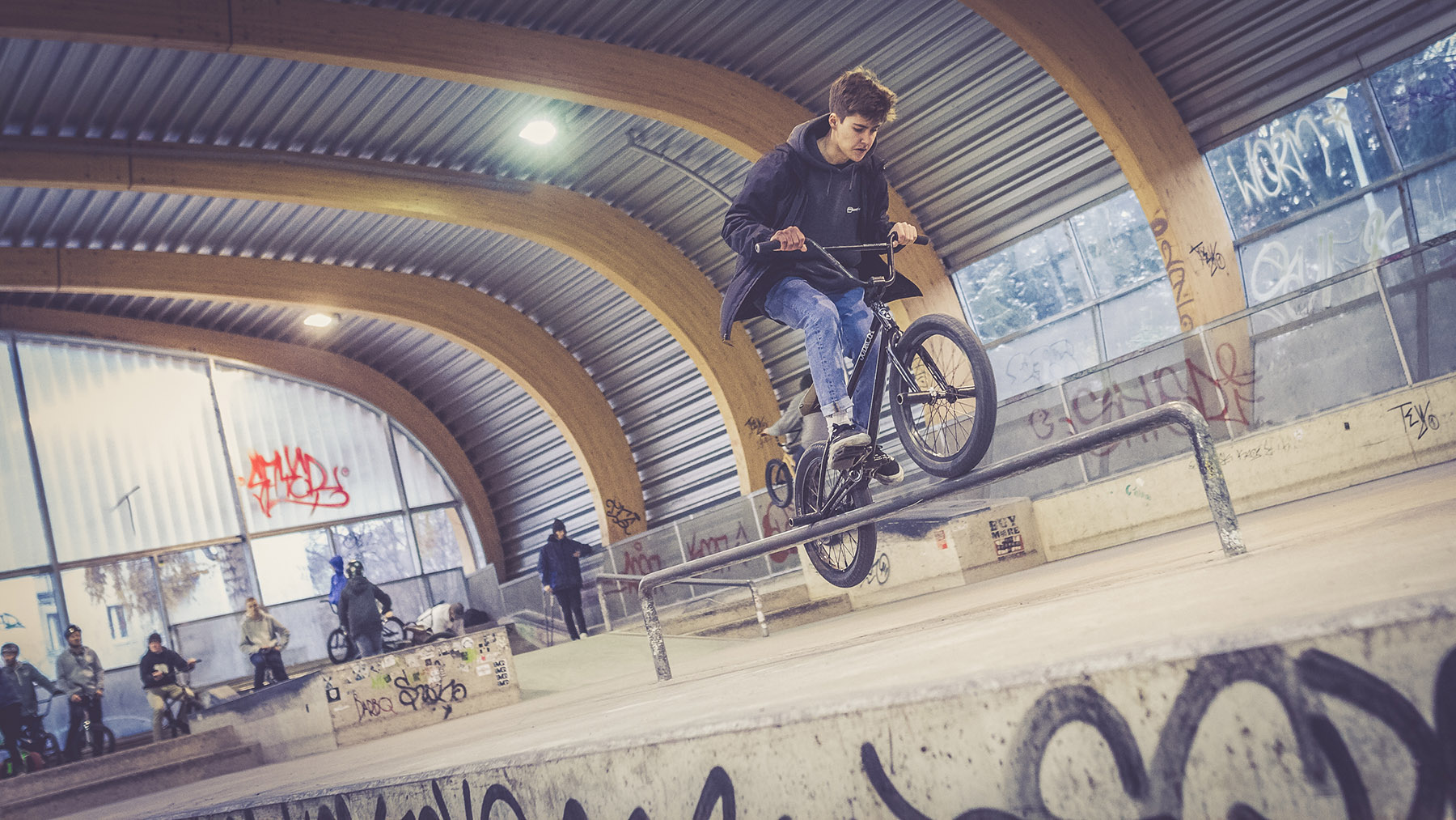 Während in den Kellerräumlichkeiten von kunstform die Flatlander sich bei einem entspannten Best-Trick-Contest battleten (das Video dazu folgt in Kürze), machte sich die Grindsportfraktion zu einer Warm-up-Session im überdachten Skatepark am Stuttgarter Pragfriedhof auf. Warm war es dort zwar nicht gerade, aber zum Glück ist der Park ziemlich weitläufig, sodass genug Platz für alle da war, um ein wenig zu fahren und so auf Betriebstemperatur für die kommenden Stunden zu kommen.