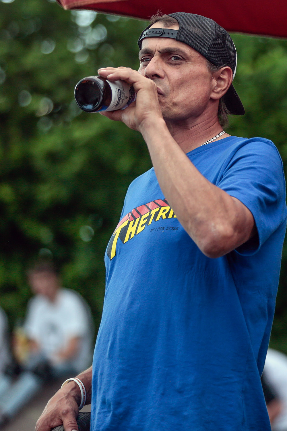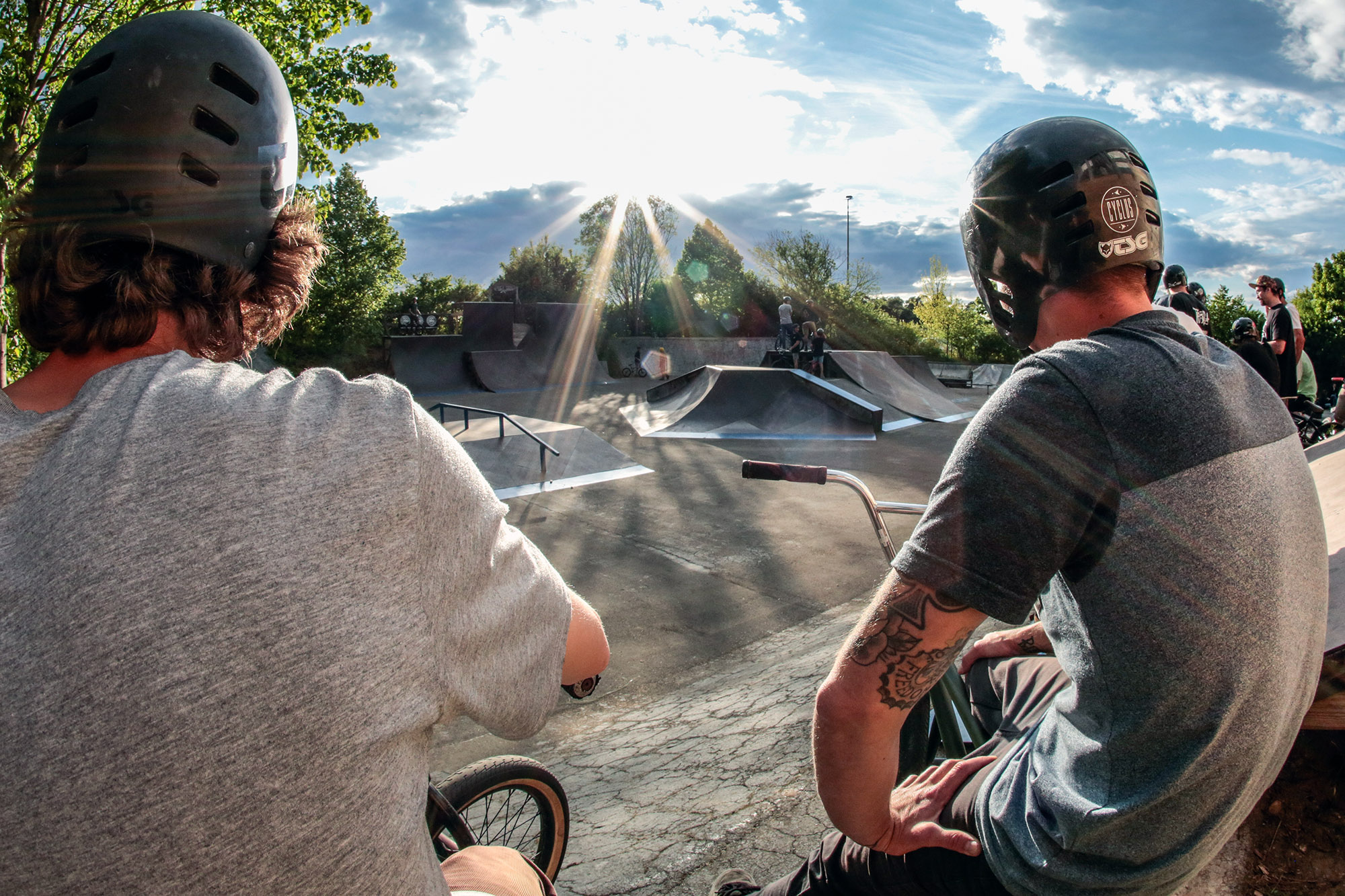 Der Platz war den ganzen Tag über gut gefüllt, denn es sollte nicht nur BMX, Skateboard und Scooter gefahren, sondern auch Thomas Stellwags Geburtstag gefeiert werden, auf dessen Initiative der Park einst gebaut worden war und der bis heute Vorsitzender des zuständigen Vereins ist. Zur Feier des Tages waren 300 Liter Freibier herbeigekarrt und 15 kg Nudel- und Kartoffelsalat zubereitet worden – von den unzähligen Kilos Fleisch und Veggieburgern, die ununterbrochen auf dem Grill brutzelten, ganz zu schweigen.