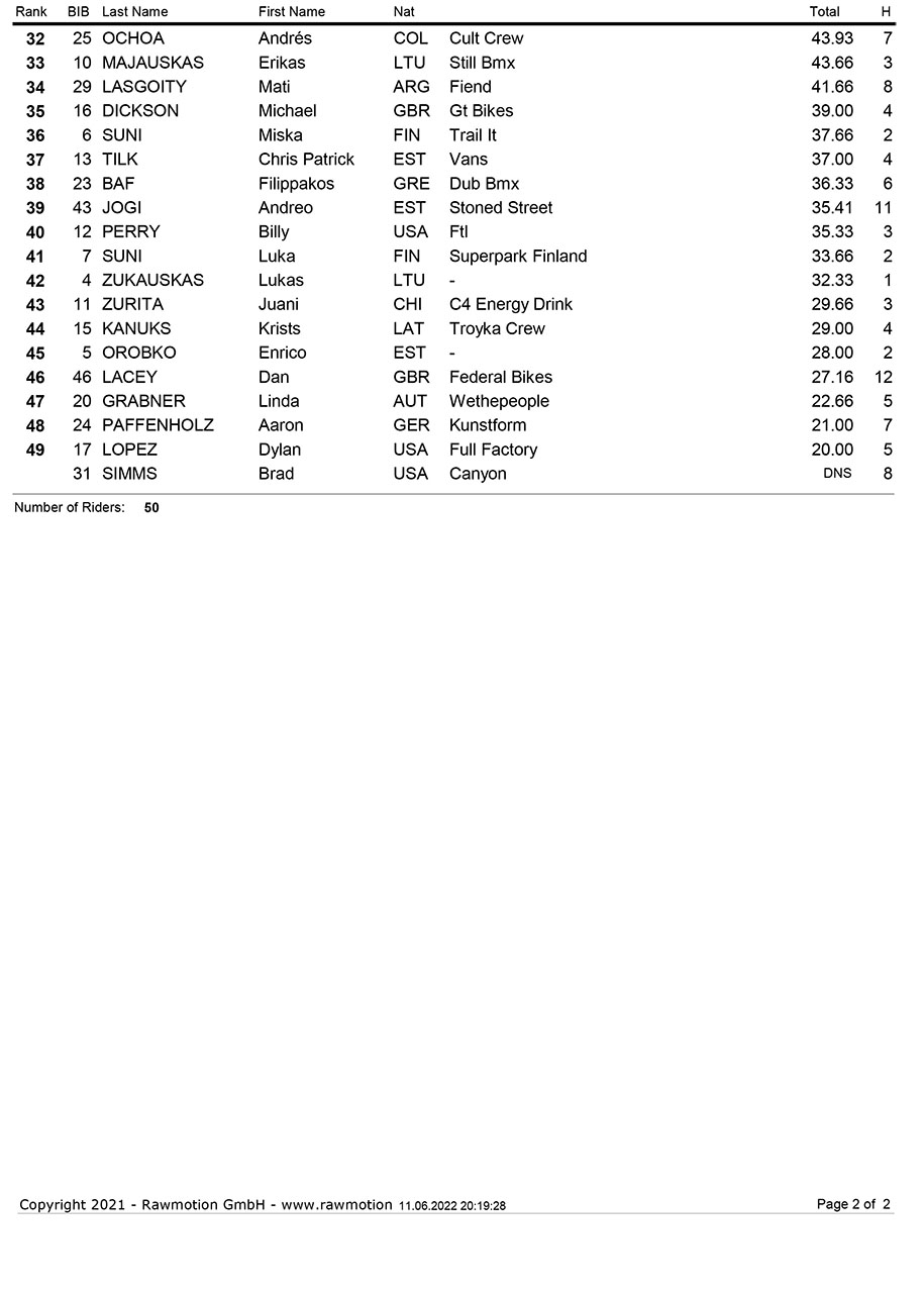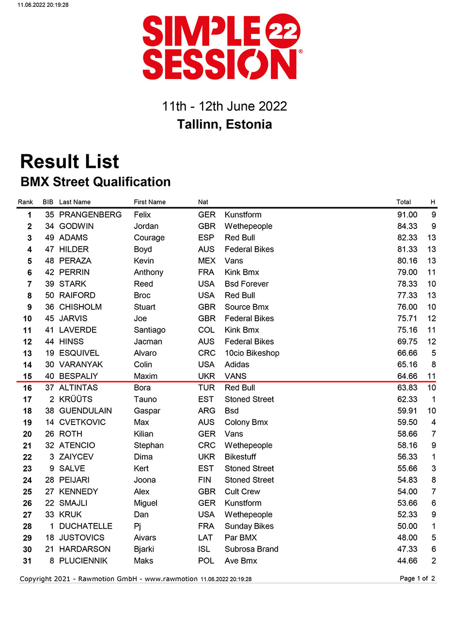 Pberg, Jordan, Courage: Hier sind die Top 3 Qualifier des BMX-Streetcontests auf der Simple Session 2022 in Tallinn, Estland.
