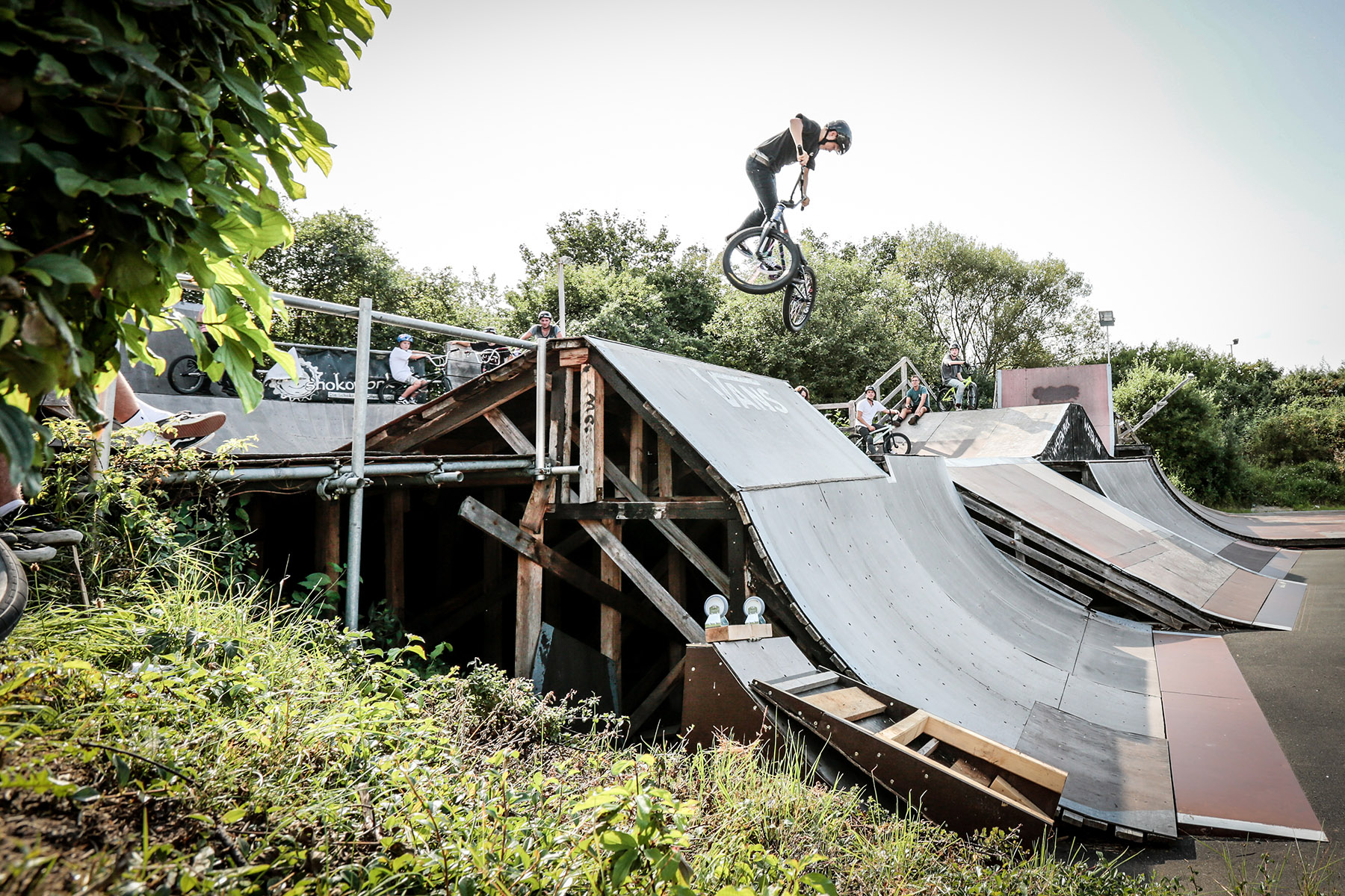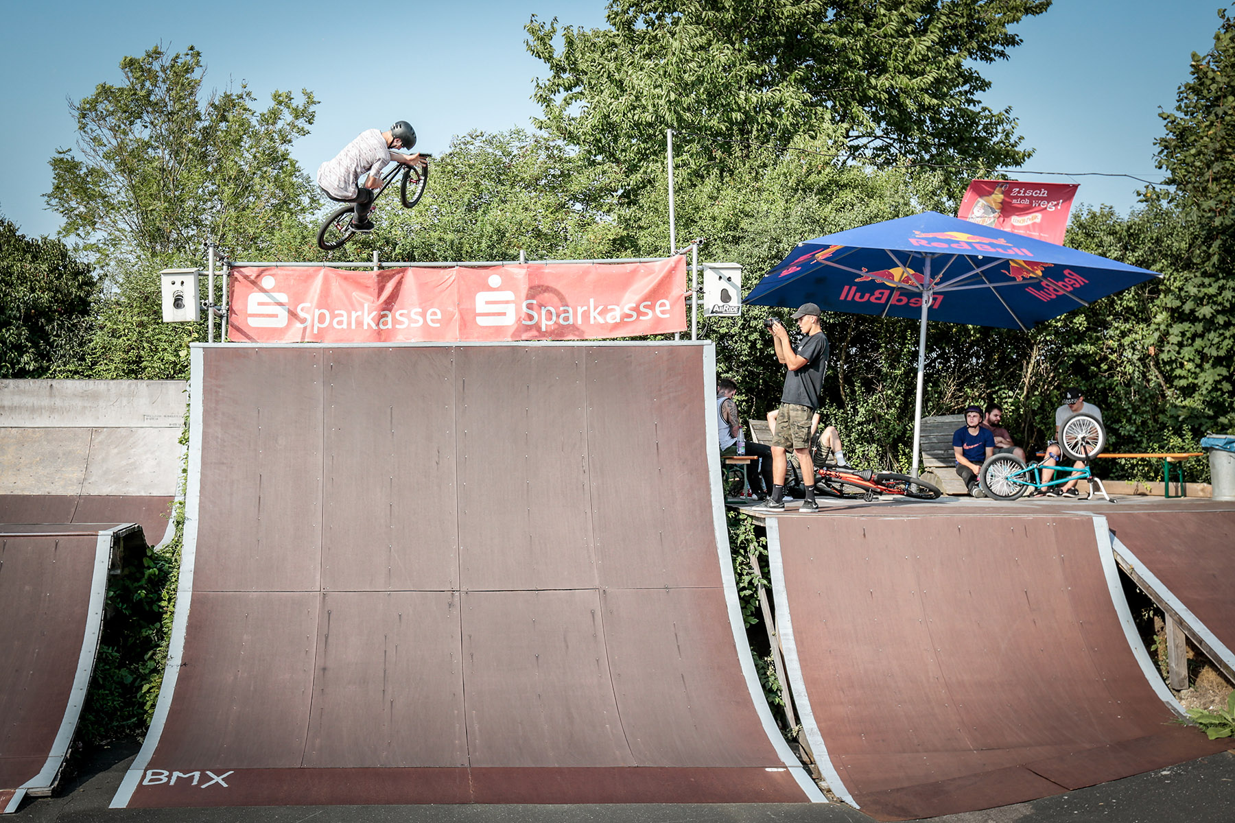 Samstagfrüh/-mittag trafen dann in regelmäßigen Abständen mehr und mehr Fahrer ein. Schön, dass es noch so viele Leute gibt, die Bock haben zu ballern, ohne das 5.000 € auf dem Tisch liegen. Den ganzen Tag konnte der Park frei genutzt und bis aufs Letzte zerlegt werden. Gegen Abend gab es dann zwei, drei kleine Challenges, an denen man teilnehmen konnte oder halt auch nicht. Beim Best-Trick-Step-Up oder Best-Move an der Spine konnte man kleine Goodies für gewagte Action abgreifen. So ging der Tag langsam dem Ende entgegen … Oder auch nicht, denn in Wendelstein gibt es kein Ende.