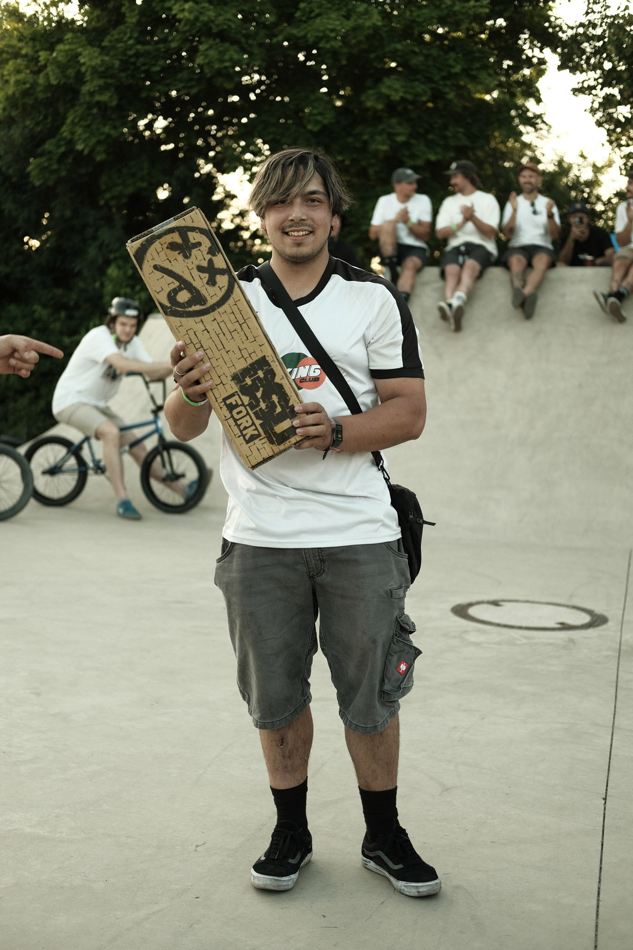 Zwar nicht in der Weite, aber dafür mit dem verrücktesten 360 über 7 Bierkästen (der Länge nach!) überzeugte Alexo Lederer die „Jury“. Damit er nach solchen Aktionen nicht bald sein halbes Rad erneuern darf, wurde er dafür mit einer nagelneuen Gabel belohnt!
