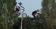 Zwei Racer beweisen, dass man in Plastikuniformen einfach besser auf dem Hinterrad balancieren kann.