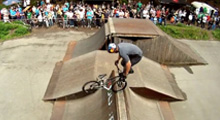 “Als Andy vor ein paar Wochen die Mail schrieb bezüglich der 20” Inch Trophy in Innsbruck, dachte ich an all die anderen Contests in Österreich, bei denen ich in der Vergangenheit war, auf denen ich immer eine super Zeit hatte. Also war klar, dass ich dahin will. In den folgenden zwei Wochen bildete sich die Crew, die nach Österreich fahren sollte und sie hätte nicht besser sein können. Denn Markus Braumann, Daniel Juchzt, Tobias Wicke und meine Wenigkeit haben alle etwas gemeinsam: Bei jedem fehlt eine Latte im Zaun, und wenn wir irgendwann kein Rad mehr fahren, dann rocken wir gemeinsam die Anstalt – Abteilung: Totalschaden. Also ab in den Leihwagen und sieben Stunden entspannt mit 180 km/h dahingefahren. Unterwegs natürlich nur Blödsinn gemacht und geredet, was sonst?! Am Abend kamen wir dann im schönen Innsbruck an und in der Dunkelheit bot sich noch nicht die unglaubliche Bergkulisse, die wir aber am nächsten Tag bewundern durften. Massiv, um es mal milde auszudrücken. Das Wetter sagte uns morgens noch: “Was wollt ihr denn hier? Ich wasche gerade”, also Regen. Aber nachmittags dann meinte es: “Schön das ihr da seid, ich mach jetzt den Ofen an”, alles trocken und erstmal einfahren auf dem Holzparcours, auf dem alles stand, was man braucht, um Spaß zu haben. Und zudem liegt der Park mehr oder weniger mitten im Wald, also wieder, was die Kulisse angeht, ein Traum und direkt auf der anderen Seite die mächtigen Berge.