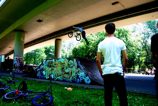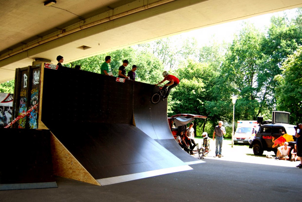 Doch wie und wo soll da ein Nachwuchscontest stattfinden? Das Wie lässt sich leicht beantworten, denn die Verantwortlichen hinter Alliance BMX, Fahrrad Goebel und Infaction waren hoch motiviert. Das Wo haben wir uns im Vorfeld ein wenig entspannter vorgestellt. Der bereits bestehende Skatepark unter der Hochbrücke ist zwar überdacht, doch war bisher recht spärlich mit Rampen ausgestattet.