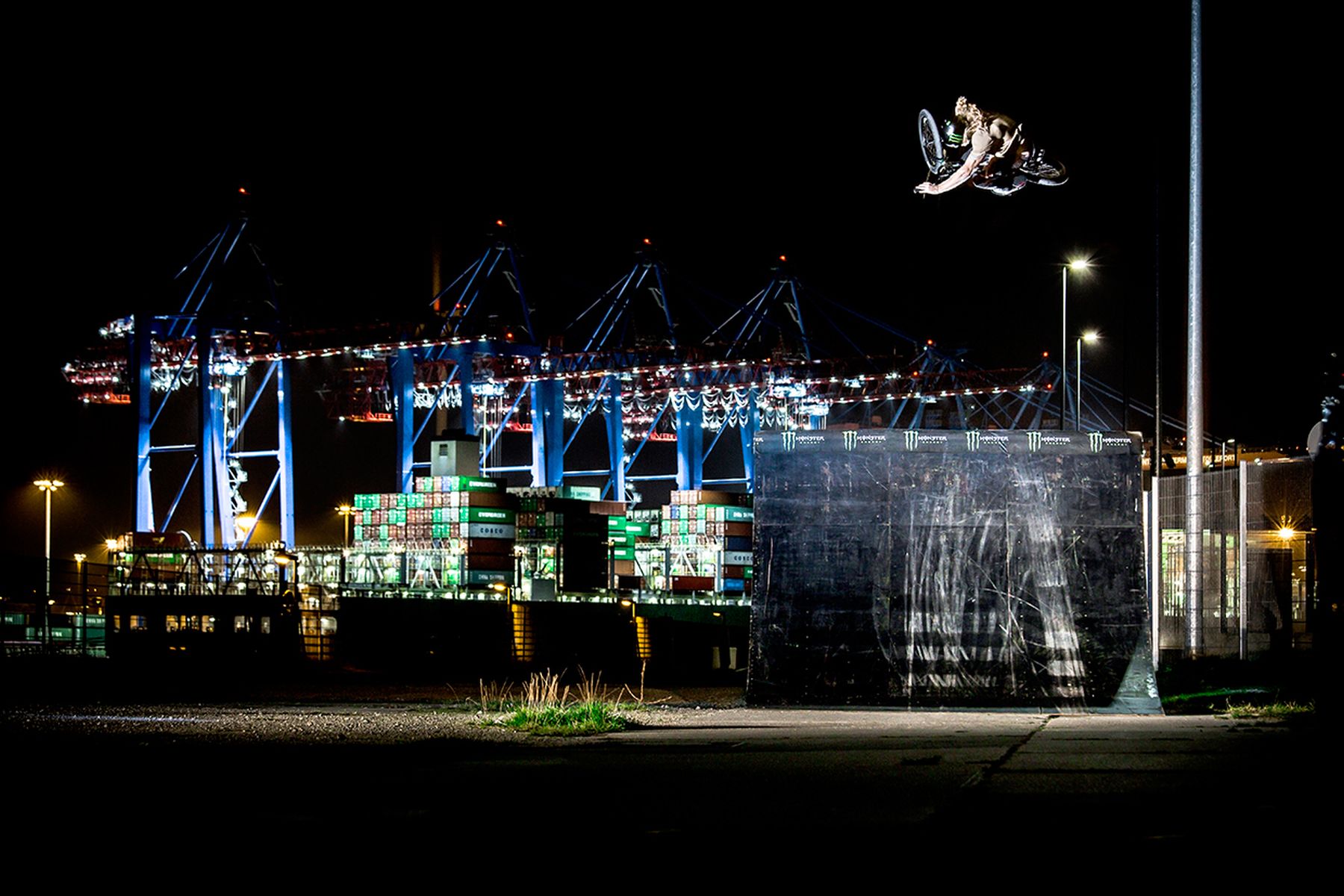 Den ersten Tag verbrachte die Crew größtenteils damit, nach Spots beziehungsweise einem geilen Hintergrund für die Fotos zu suchen. Schließlich wurden die Jungs nach mehreren Stunden im Hamburger Hafen fündig, wo Christian Lutz und Tim Korbmacher, die Rampe im Scheinwerfer Licht der Autos aufbauten. Währenddessen holte Simon Greg Illingworth vom Flughafen ab, ohne zu wissen, ob der so spät am Abend, überhaupt noch Bock haben würde, BMX zu fahren. Hatte er aber natürlich, was angesichts der tollen Location auch kein Wunder war. Und so schossen sich die beiden kurz darauf in den Nachthimmel der Hansestadt.