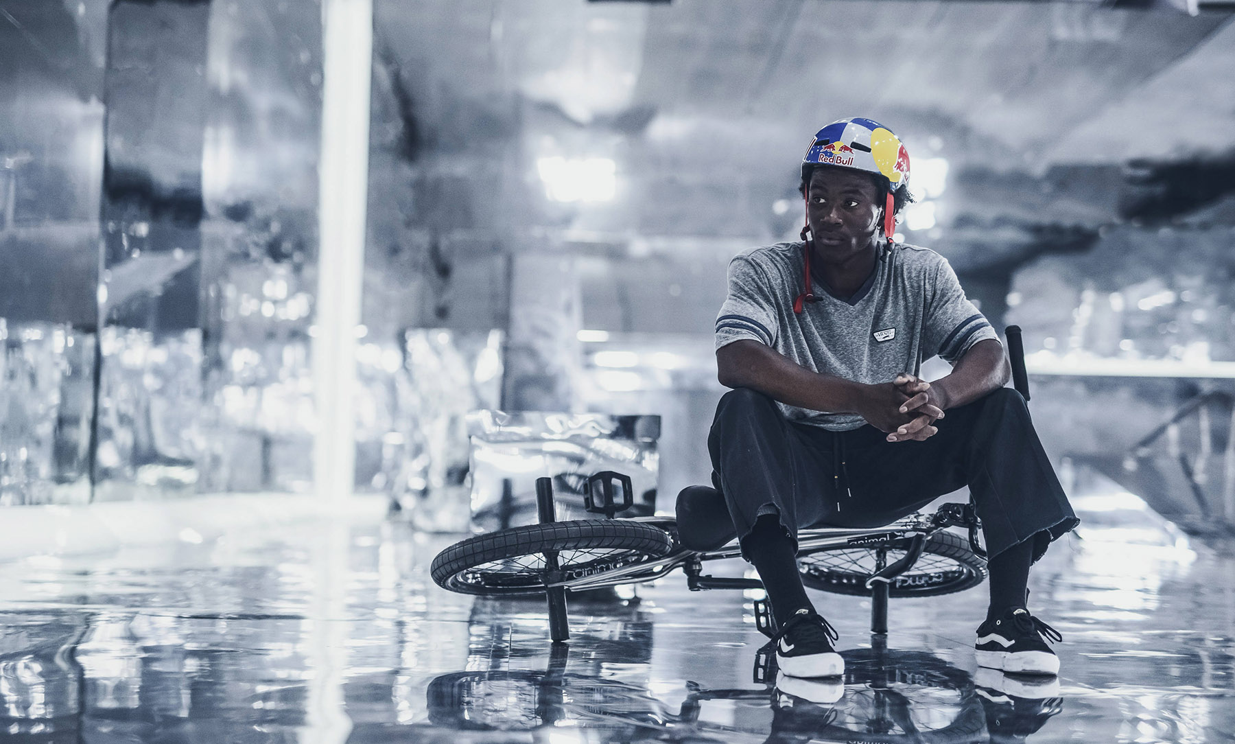 Neben einem Schwung (unten) und einem Behind-the-scenes-Edit (noch weiter unten) hätten wir da zum Beispiel ein Making of aus dem Mirror Park (oben), das ziemlich interessant ist, denn die Dreharbeiten dazu waren ziemlich kompliziert – und das nicht nur für die Fahrer, die sich erst einmal an die verspiegelte Oberfläche der Rampen gewöhnen mussten, was anscheinend ganz schön schwierig war. Erschwerend kam für das Produktionsteam hinzu, dass man auf den Rampen aufgrund ihrer Verspiegelung natürlich das ganze Drumherum bestens sehen konnte (Licht, Kameraleute etc.). Also wurde ein Videoeffektspezialist engagiert, der das alles raus retuschiert hat. Und weil er schon mal dabei war, hat er gleich noch die Decke der Halle nachträglich am Computer verspiegelt, an der hingen während des Filmens nämlich aus irgendeinem Grund keine Spiegel. Hört sich nicht nur nach einer Menge Arbeit an, war es auch. Aber seht selbst …