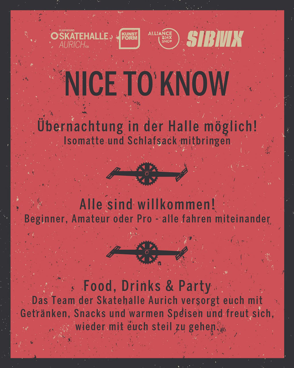Start ist am 02.12.2023 um 12 Uhr. Von nachmittags an bis in den Abend wird es die üblichen mehr oder weniger sinnvollen Spielchen auf und neben dem BMX geben, bei denen Ihr von Alliance BMX, dem kunstform BMX Shop sowie von SIBMX, Sunday Bikes und Verde Bikes Sachpreise ergattern könnt.