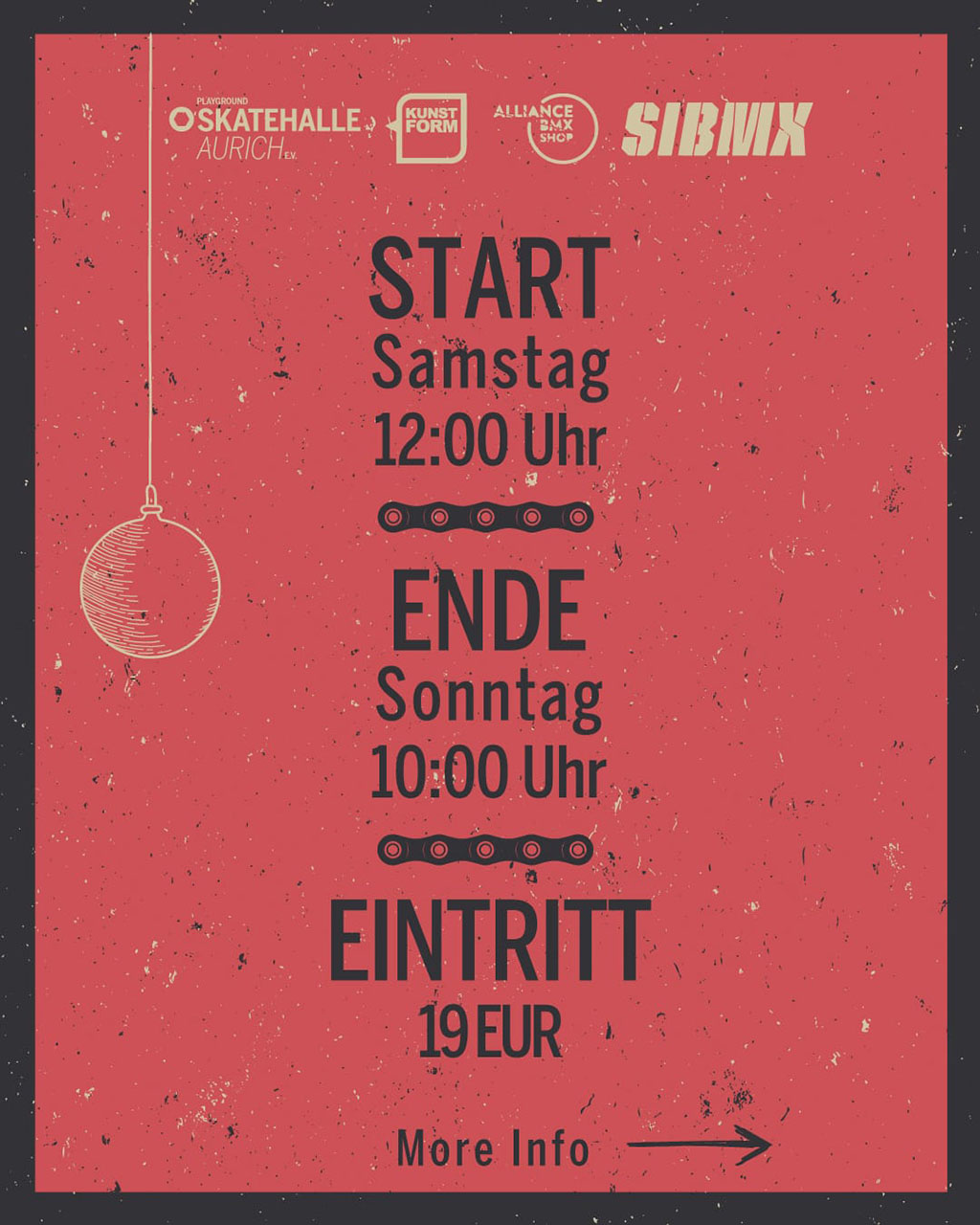 Im wunderschönen Aurich soll am 1. Advent wieder einmal der Merry Crisis Jam stattfinden. Neben Spekulatius und Glühwein wird es 24h BMX-Action geben, während der alle Bereiche der größten Skatehalle Deutschlands durchmassiert werden.