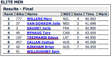 Bei den Frauen sah es ähnlich aus: Regula Runge schaffte es bis ins Viertelfinale, aber leider nicht weiter. Am heftigsten ging es im Elite Men Finale ab. Marc Willers aus Neuseeland fuhr einen Start-Ziel Sieg ein und schon nach der zweiten Geraden passierte nichts mehr auf den vorderen vier Plätzen. Marc fuhr einfach allen davon.