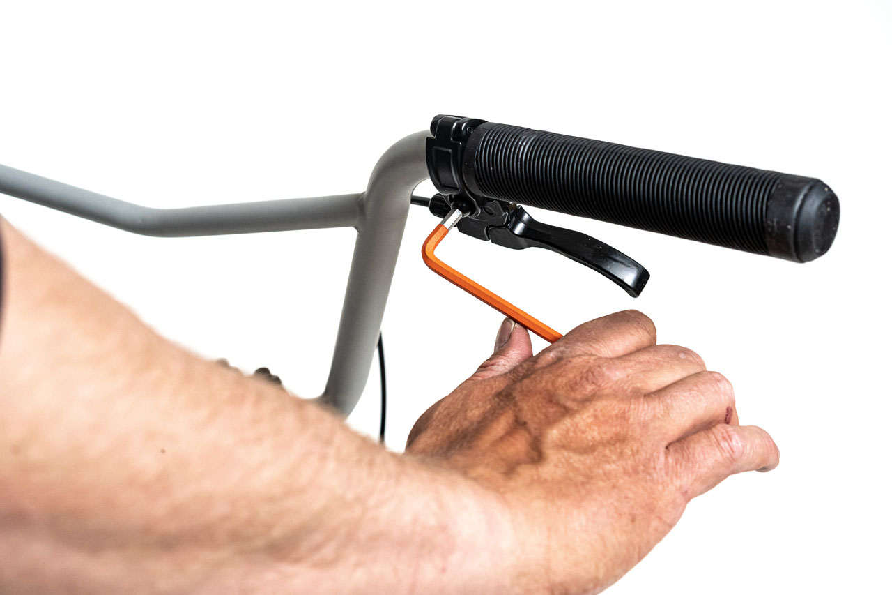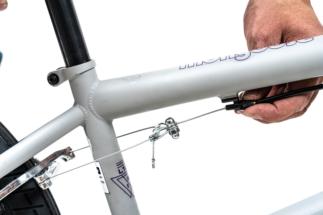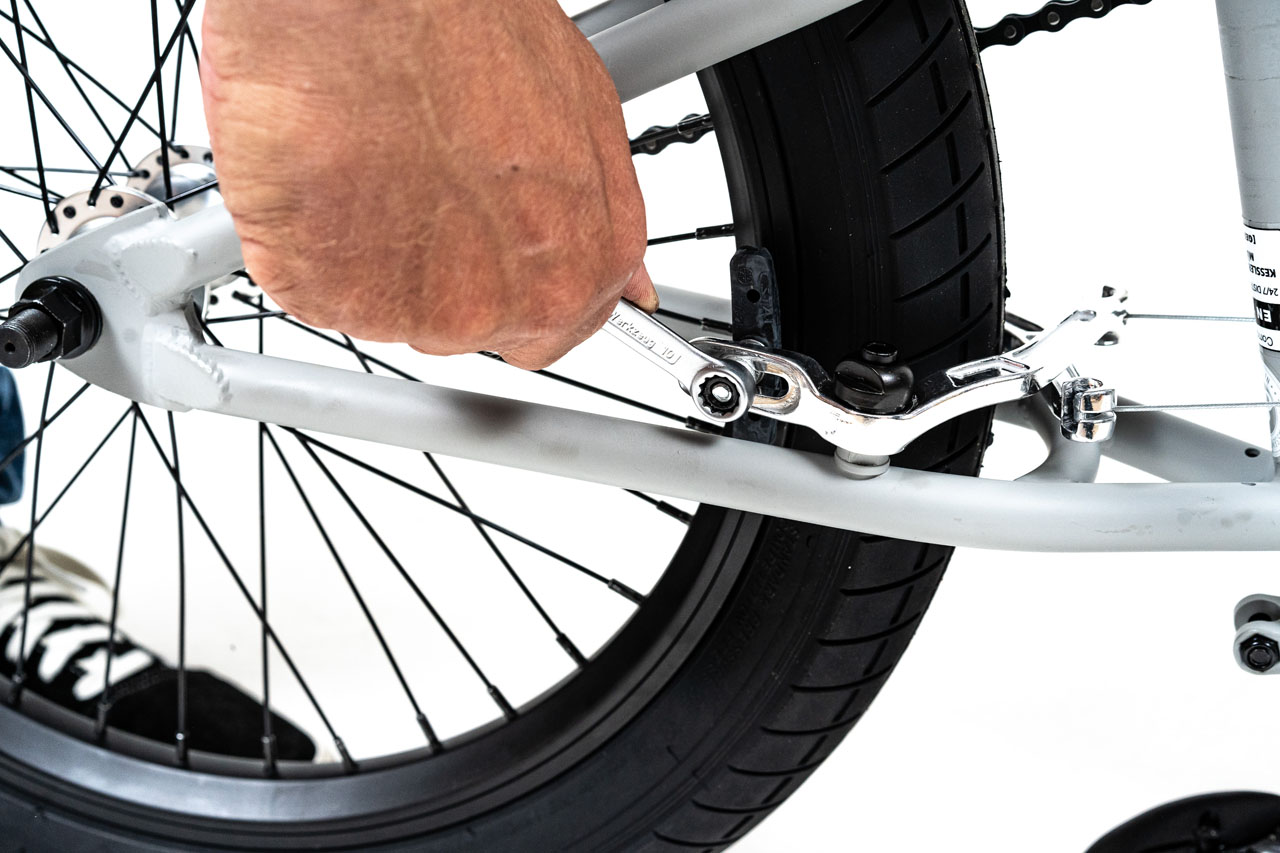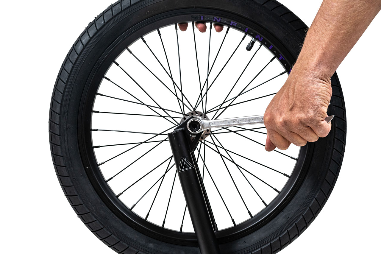Stelle das Rad auf den Kopf und lege das Vorderrad in die Ausfallenden (engl. dropouts). Vergewissere dich, dass die Konusmuttern kein Spiel haben und ziehe dann die Achsmuttern fest. Wenn du Pegs anbauen möchtest, brauchst du dafür eine Verlängerung.