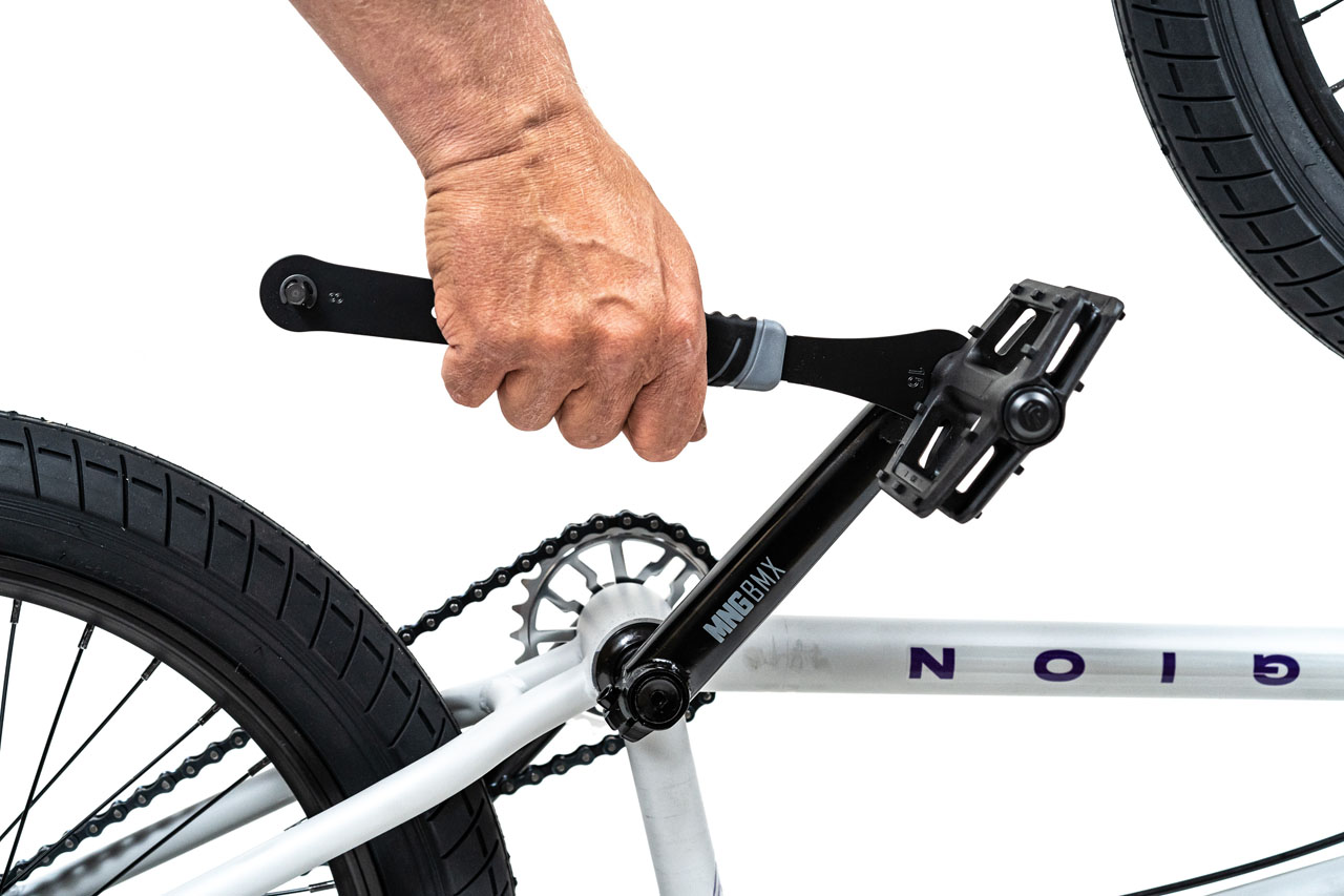“Die Pedale werden, wenn du von oben auf der Rad guckst, in Richtung Vorderrad beziehungsweise Fahrtrichtung festgezogen.”