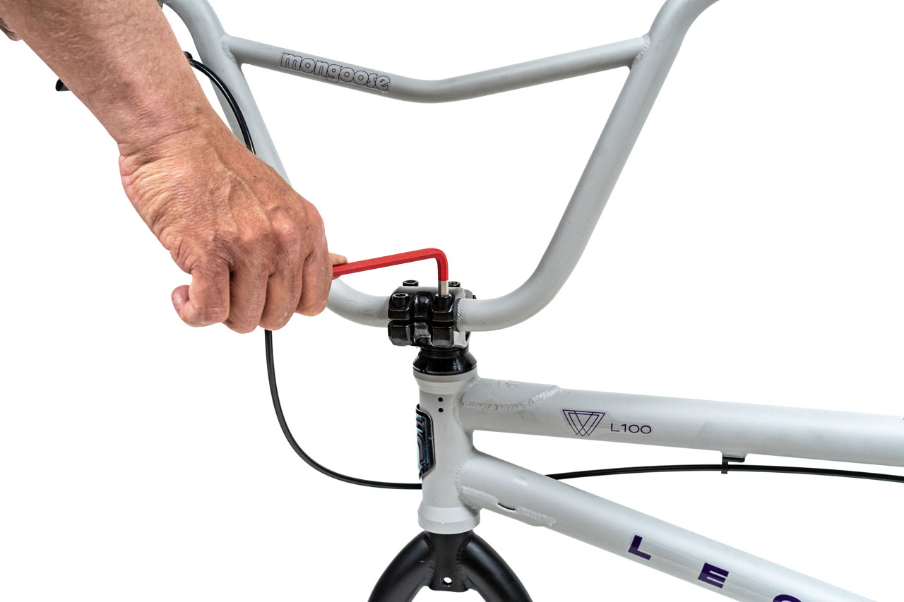 Die Vorbauschrauben werden gleichmäßig über Kreuz festgezogen. Sie sollten fest sitzen, aber nicht mit aller Kraft angezogen werden, weil sonst die Gewinde beschädigt werden. Du entscheidest, ob der Lenker rechtwinklig zum Boden, oder lieber etwas zurück bzw. nach vorn gebeugt eingestellt ist.