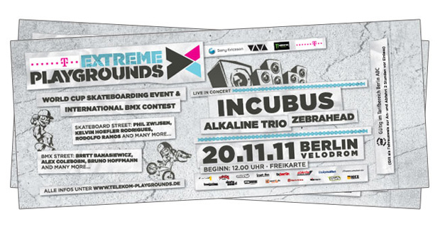 Sei dabei, wenn Brett “Maddog” Banasiewicz, Mark Webb, Bruno Hoffmann und elf weitere Gefahrensucher am 20. November 2011 nach Berlin kommen und es gemeinsam mit Incubus, dem Alkaline Trio und Zebrahead im Velodrom so richtig krachen lassen! In unserem Gewinnspiel hast du die Chance 3×2 Eintrittskarten, ein Sony Ericsson Walkman™ Musik-Handy oder 2×1 Telekom Extreme Playgrounds New Era Truckkappe zu gewinnen. Und das ist gar nicht schwierig!
