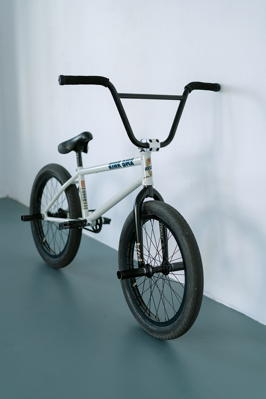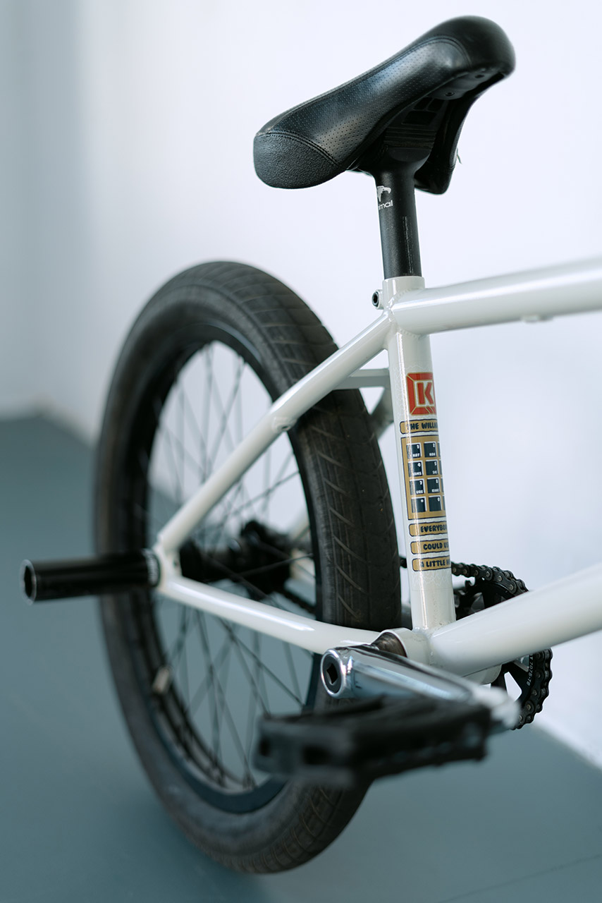 Rahmen: Kink Williams Gloss Bone in 20,5″ Gabel: Kink Stoic Forks mit 20 mm Vorlauf Lenker: Kink Williams in 9,25″ Griffe: Animal Edwin Lenkerenden: Animal Edwin Bremsanlage: keine Vorbau: Fiend Reynolds Steuersatz: Kink Integrated II Sattel: Kink Ericsson Seat Sattelstütze: Animal Kurbel: Kink Brace in 165 mm Tretlager: Animal Mid BB Pedale: Kink Hemlock Kettenblatt: Kink Bedlam Übersetzung: 25/9 Kette: WTP Supply Reifen: Schwalbe Big Street in 2,15″ Laufräder: Odyssey “Hazard Lite”-Felgen mit Shadow “Symbol”-Naben hinten und vorne Hubguards: Shadow Symbol Plastic und Rant Party Plastic Pegs: Shadow Little One in 4,33″ Modifikationen: Lenker an beiden Enden um 2 cm gekürzt Reifendruck: 2,8 bar +/- Gewicht: ca. 11 kg Körpergröße: 1,76 m