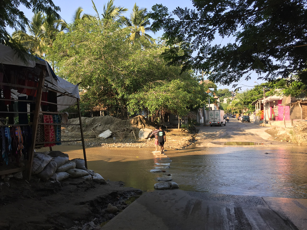 Jooa, also das Leben in Puerto Vallarta ist wirklich maximal entspannt. Gerade auch im Vergleich zur Millionenstadt Guadalajara geht es dort schon anders zu. Ein normaler Tag in Puerto Vallarta – uff! So gegen 9 Uhr vielleicht mal aufstehen, frühstücken. Dann an den Skatepark, bis die Mittagshitze kommt. Wenn es keinen Plan im Sinne von Strand, Fluss oder sowas gab, war ich zur Mittagszeit meistens daheim. Dann Gitarre spielen, ins Planschbecken hüpfen, in der Hängematte nappen oder doch mal eine Prüfung oder Hausarbeit für meinen 15-jährigen „Schüler“ machen. Gegen Abend dann eventuell an den Strand surfen oder nochmal ein Ründchen an den Skatepark, meistens dann mit Bierchen. Und dann in eine Bar, Billard spielen, am Strand chillen, oder wo auch immer gerade Party geht. BMX-technisch geht halt leider echt nicht viel in Puerto Vallarta. Also da gibt’s so vier, fünf Semi-Motivierte und dann noch drei Kiddies – das war’s. Die Skate- und Surfszene ist dafür aber umso besser vertreten.