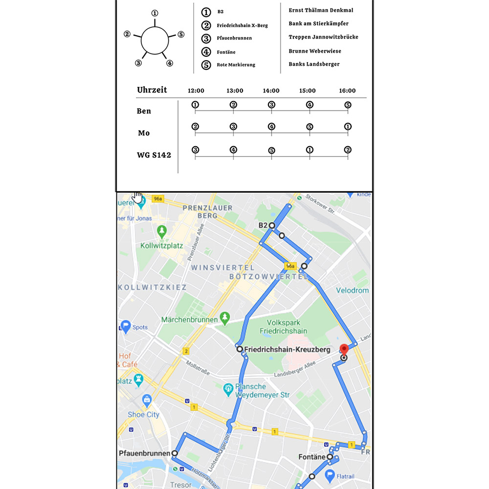 Um zu wissen, welches Team bzw. welche Person sich zu welcher Zeit an welchem Spot einfinden sollte, wurde eine entsprechende Corona Map erstellt. Darauf sind die Uhrzeiten und die Spots zu finden, die einzuhalten waren.