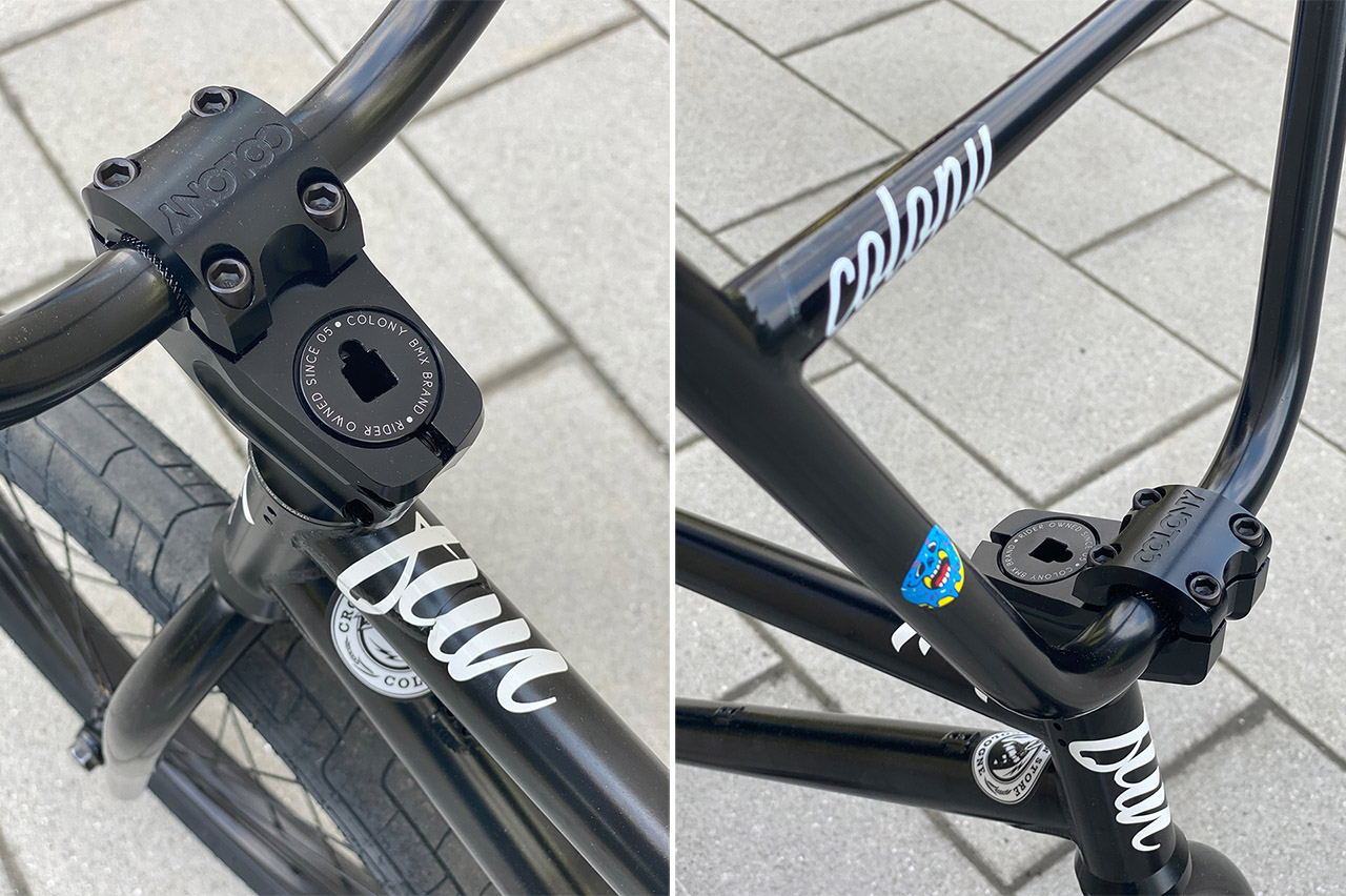 Rahmen: Colony Blaster in 21″ (Chris James Signature) Gabel: Colony Sweet Tooth (25 mm Vorlauf) Lenker: Colony Sweet Tooth in 9,4“ Griffe: Colony Much Room Lenkerenden: Colony Standard Bremsanlage: – Vorbau: Colony Squareback Steuersatz: Colony Tall Headset Sattel: Colony Plume Seat (Jayden Fuller Signature) Sattelstütze: Colony (Pivotal) Kurbel: Colony Venator (175 mm) Tretlager: Colony Mid BB Pedale: Colony Fantastic Plastic Kettenblatt: Colony Blaster Übersetzung: 28:9 Kette: Shadow Interlock Reifen: Colony Griplock in 2,35″ Laufräder: Colony Wasp Lite auf Colony Contour Rim hinten, Colony Pintour Front Wheel vorne Hubguards: – Pegs: – Modifikationen: Gabel um ca. 1 cm gekürzt Reifendruck: 5,5 Bar Gewicht: ca. 9-10 kg?! Körpergröße: 1,78 m