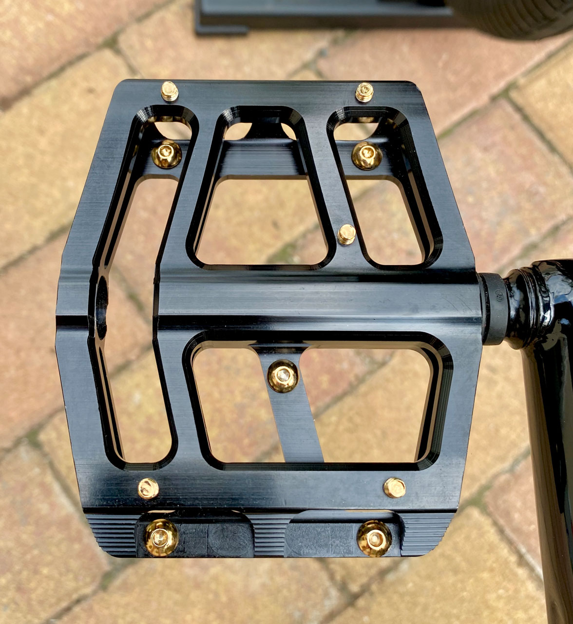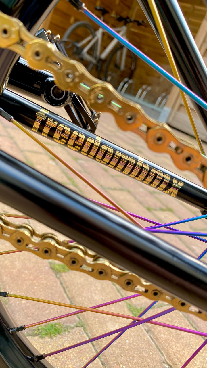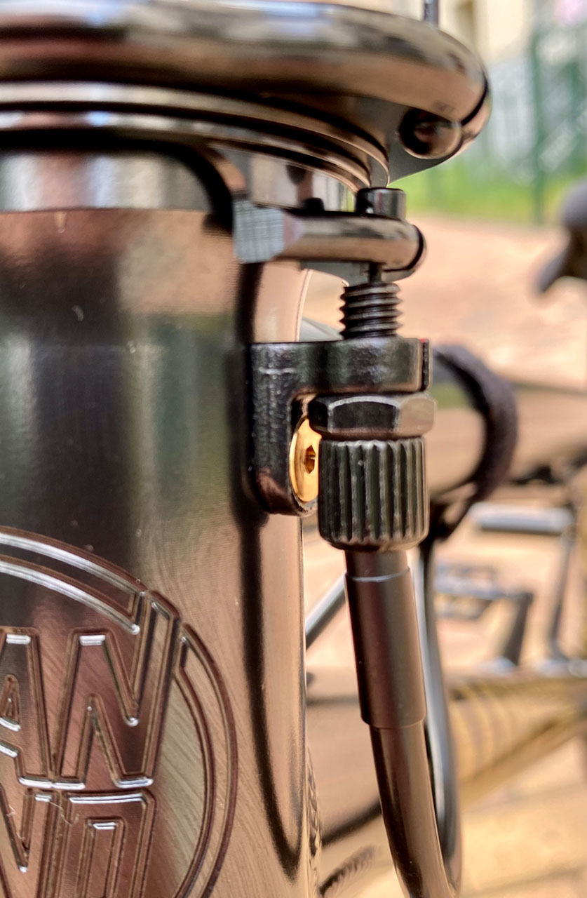 Modifikationen: viele Titan-, Aluminium-, und Stahlschrauben wurden vergoldet. Diverse Schwarzlackierungen an Bremskabel, Pedale etc., da kein silber/chrome am Rad sein sollte. Tubolito-Schläuche. Sattellogo wurde später noch eingefärbt (schwarz) und hat eine Pivotalschraube aus Titan bekommen.