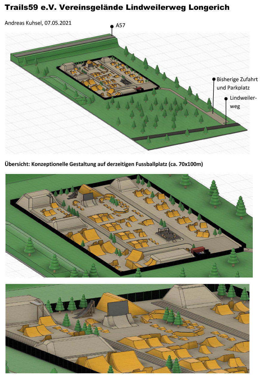 Da tut sich was in Köln! Nachdem die Trails59 an den AbenteuerHallenKALK im vergangenen Jahr platt gemacht wurden, stehen die Zeichen für ein neues Gelände anscheinend recht gut. Noch weiß niemand so genau, wann es genau losgehen soll. Aber zum Warmfreuen haben wir hier schonmal die ersten Entwürfe für die neue Anlage. Da läuft einem doch glatt das Wasser im Munde zusammen, oder? Also am besten sofort auf www.trails59.de Mitglied werden. Der Verein hat nicht nur jede Unterstützung verdient, sondern kann sie auch gebrauchen!